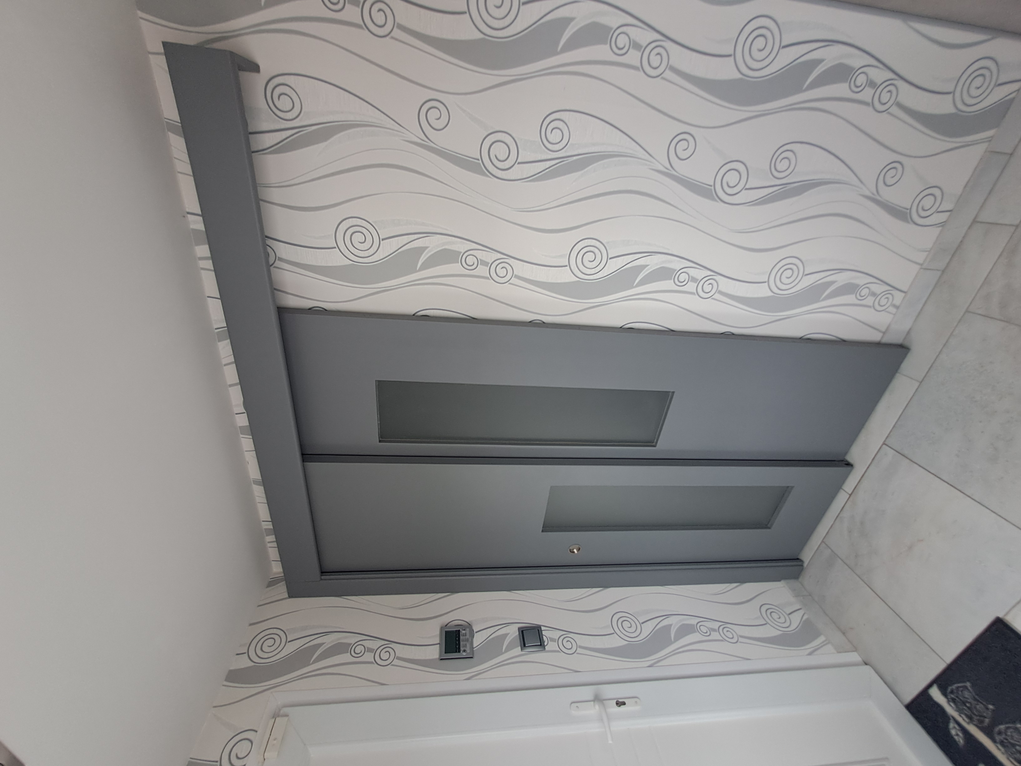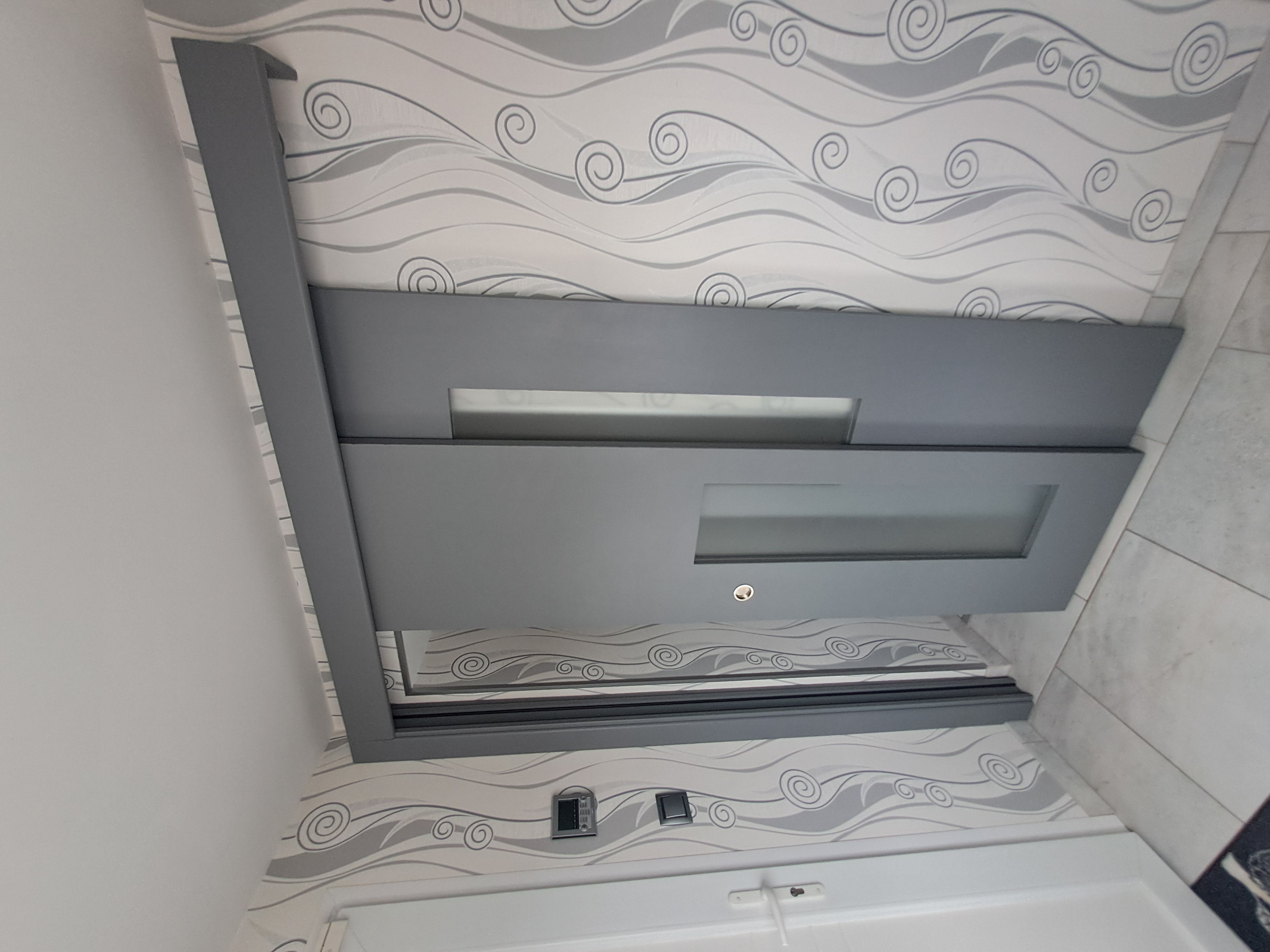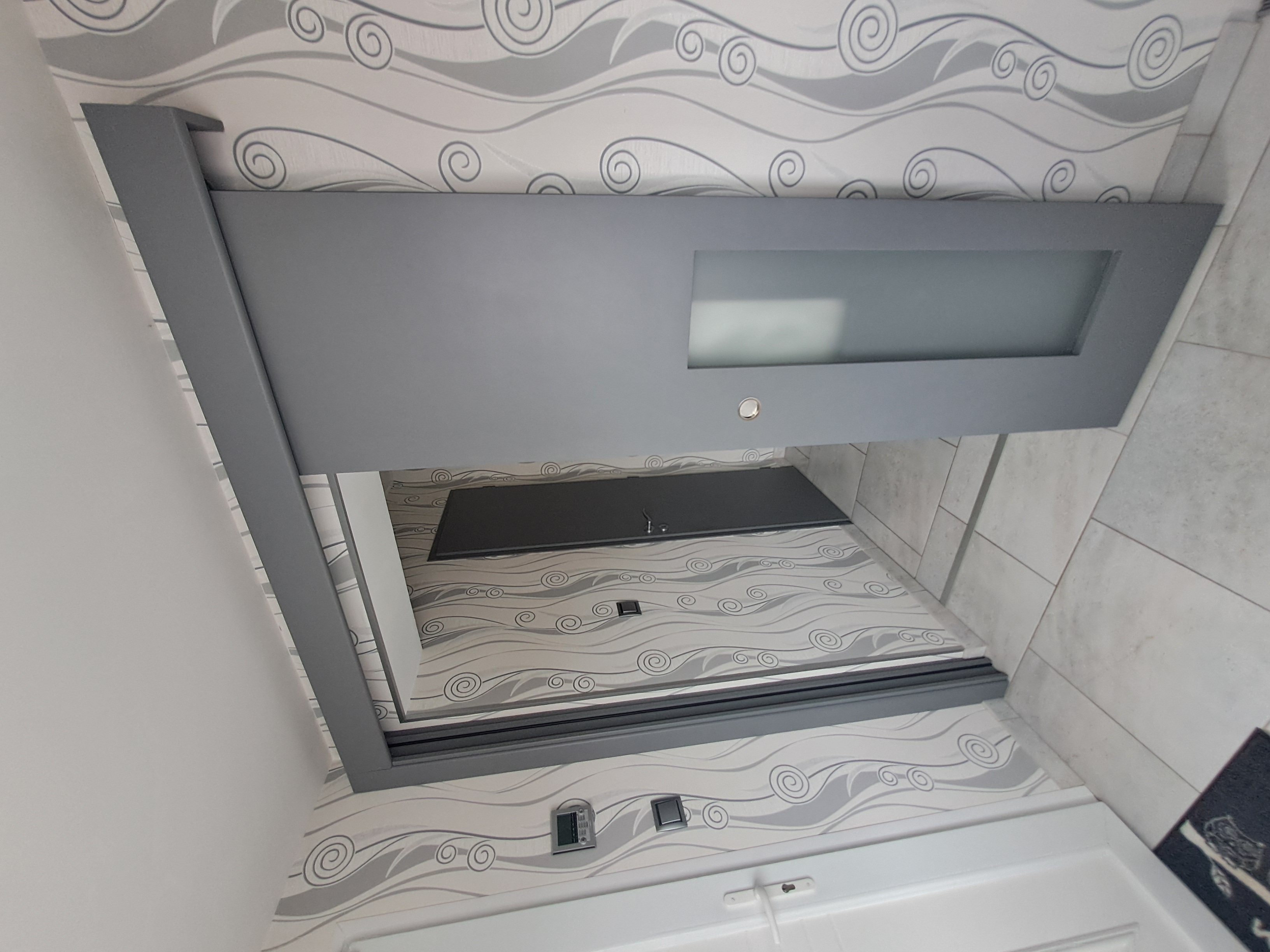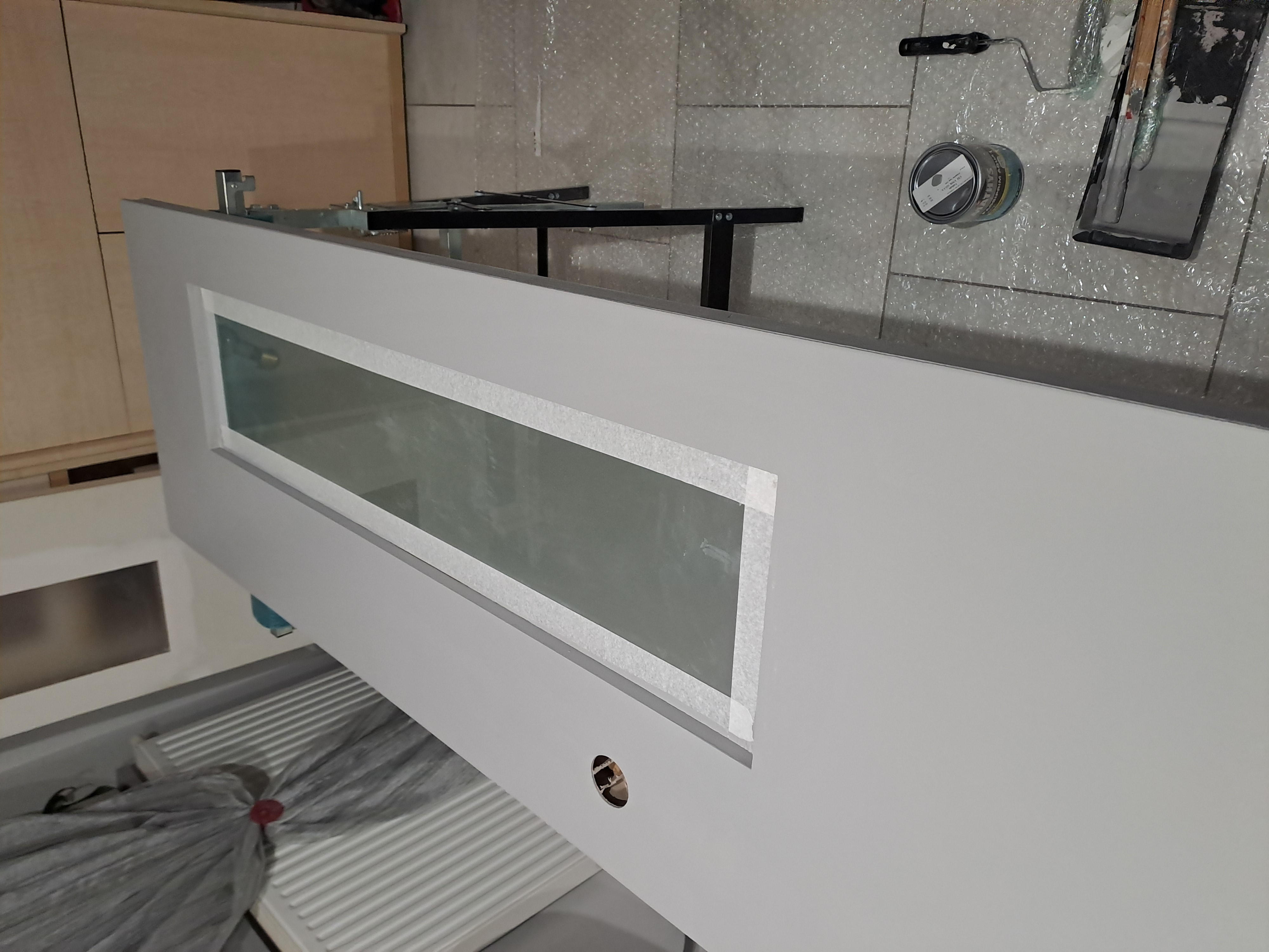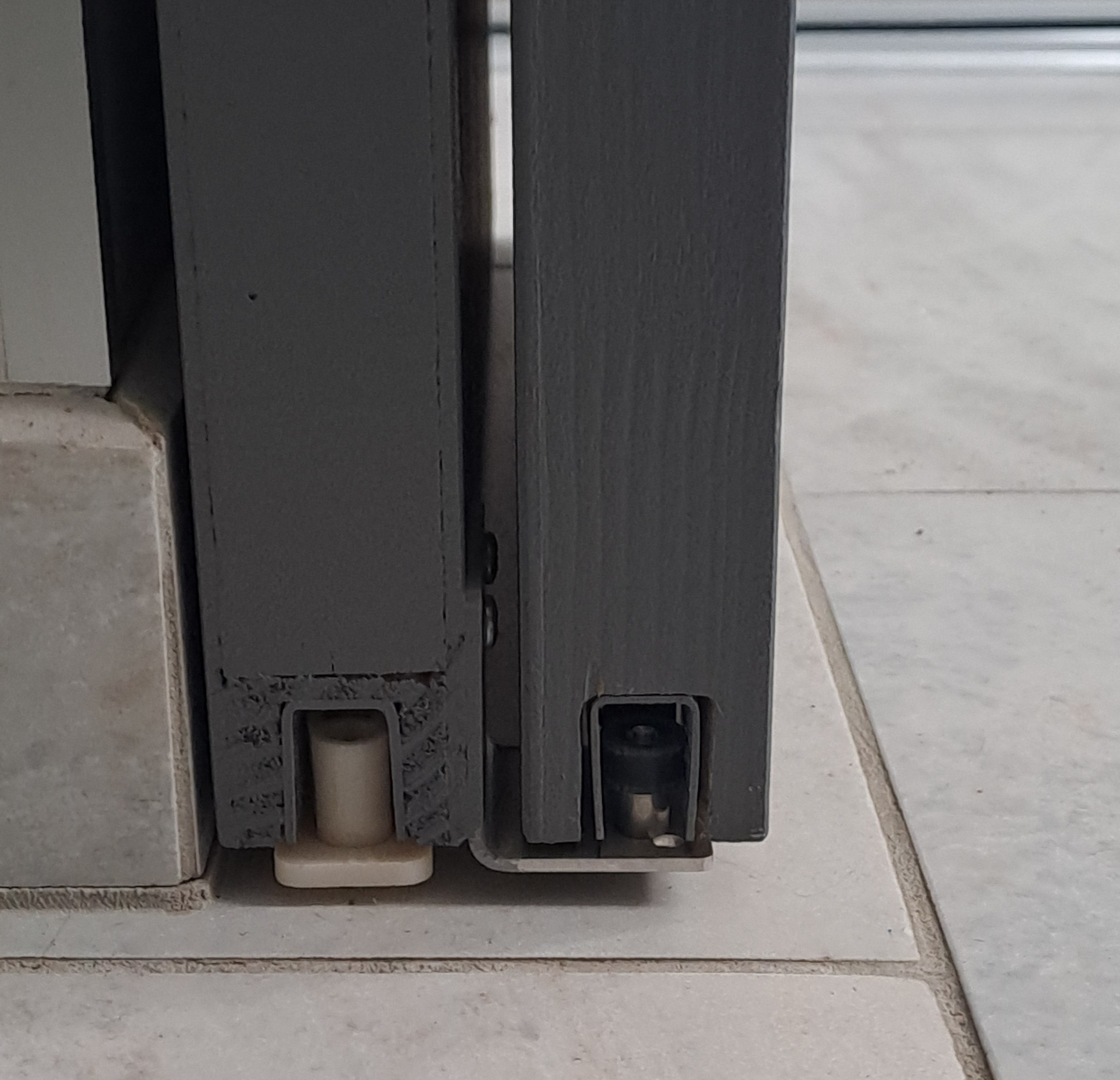 Un rainurage a été réalisé en partie basse du panneau pour placer le profil en U et permettre le passage du guide au sol positionné devant le mur. Les portes ont enfin été peintes en gris, en harmonie avec l’ambiance de son intérieur. Le bandeau et le montant ont également été fabriqués sur mesure en médium pour assurer une finition soignée et cohérente avec l’ensemble.