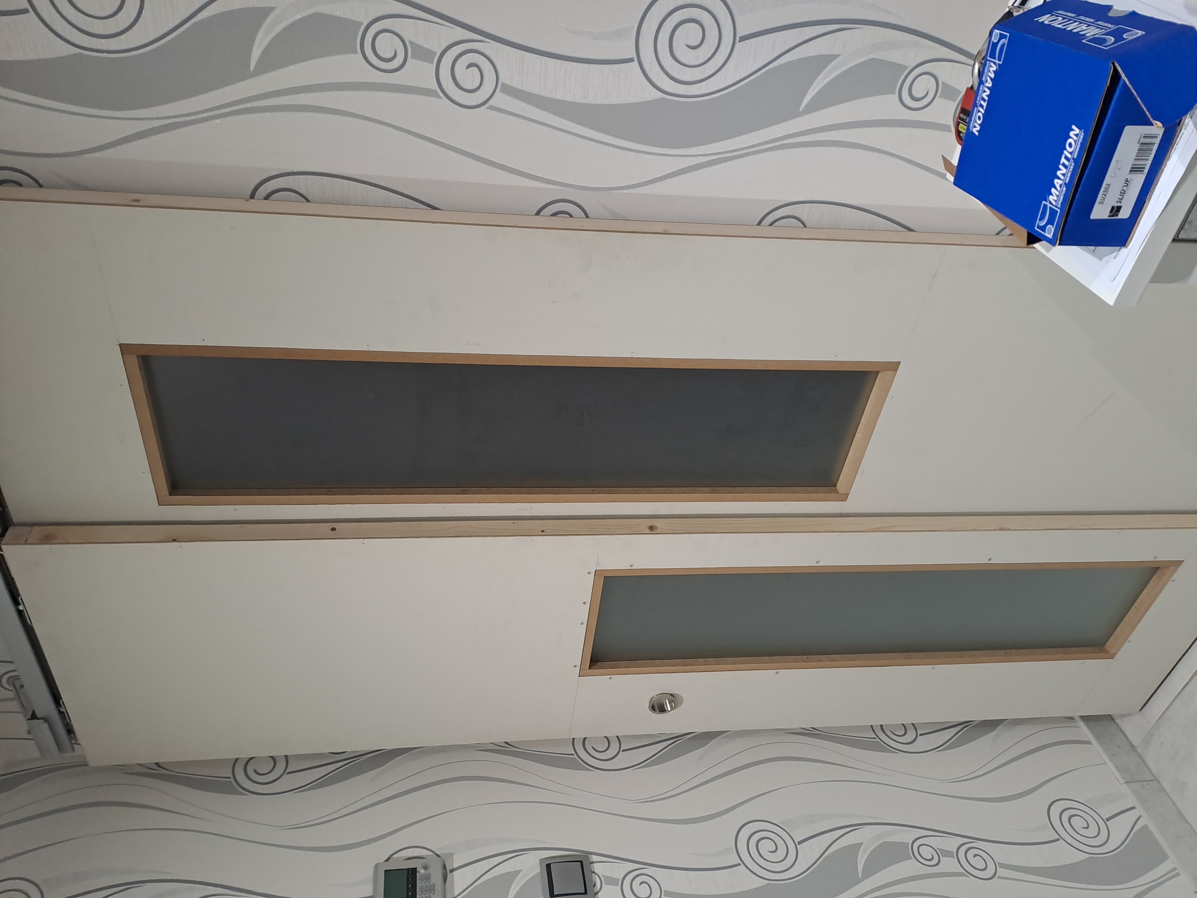 Les portes ont été entièrement réalisées par Jérôme à partir de deux vantaux de 63 cm de large, qu’il a recoupé en hauteur et en largeur pour s’adapter parfaitement à l’ouverture. Il a ensuite intégré du verre dépoli afin de laisser circuler la lumière, tout en conservant une séparation visuelle.