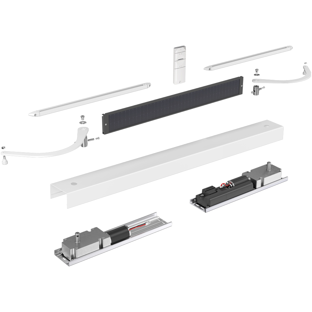 - deux blocs moteur avec batterie intégrée - deux bras débrayables - deux glissières - un panneau solaire - un gabarit de perçage - des vis de fixation - un carter d’habillage en aluminium - une télécommande radio |
